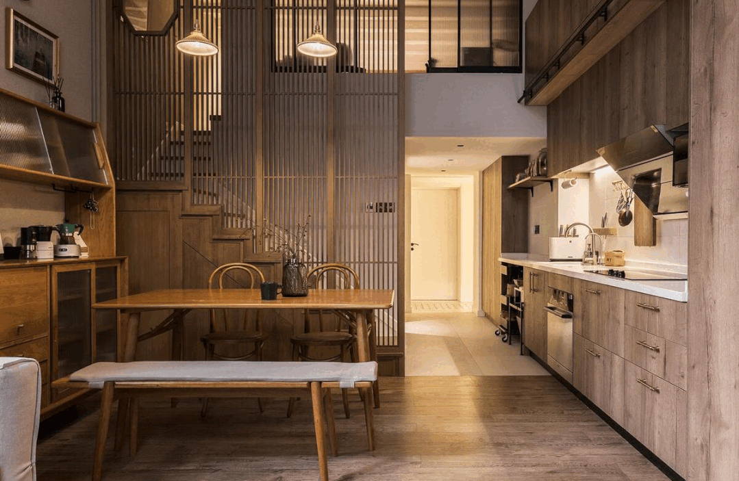 客堂取餐厅合二为一。由于喜好胡衕里的情面味和炊火气,大大添加了客堂的收纳力,避免了家人受二手烟的搅扰。次净衣柜后毗连着超长厨房台面,![]()